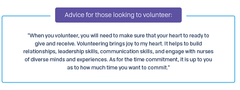 Susan really enjoys encouraging dialogue among members to help share different thoughts on a topic. A recent question she posed was on implicit bias and how the content is integrated into a nursing program’s curriculum. “As a volunteer, I enjoy giving back to my nursing profession. I hold experiences and knowledge that others may not have. Volunteering has allowed me to be fulfilled with joy and given me the opportunity to Be Bold.”